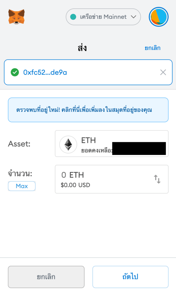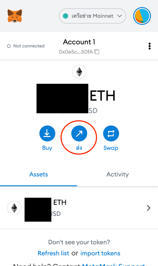 หลังจากได้ ETH address ของปลายทางมาแล้วให้เรามาที่ MetaMask ครับ เชคให้ชัวร์ว่าอยู่ที่ Mainnet เสร็จแล้วเลือกเหรียญ ETH -> Send(ส่ง) แล้วเอา ETH address ที่ copy มาวางลงไปเชคให้ดีนะครับว่า address ถูกต้อง