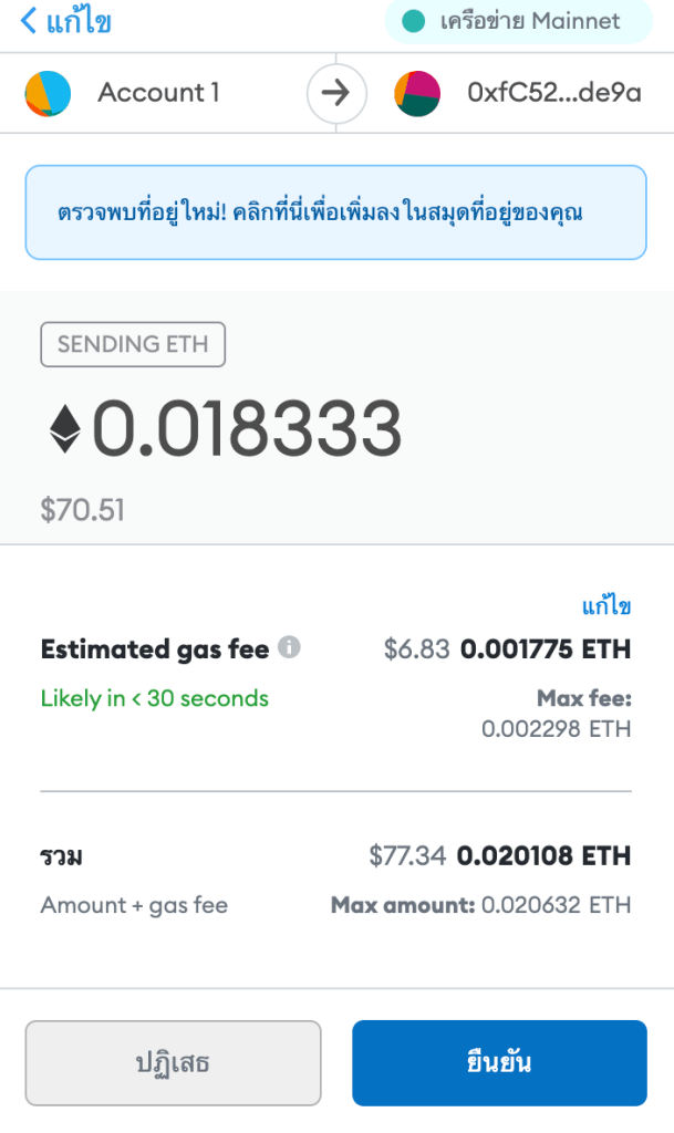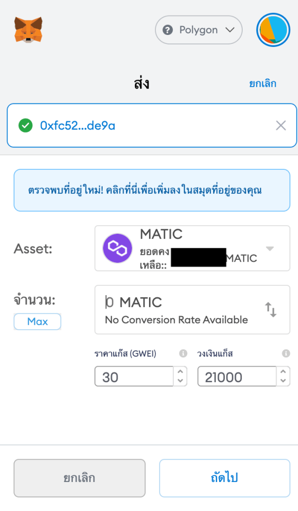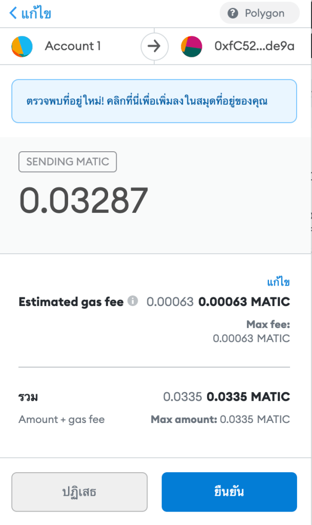 กรอกจำนวนเหรียญที่ต้องการส่ง ใน Matic สามารถกำหนดวงเงินค่า gas ได้แต่ไม่แนะนำให้แก้นะครับเพราะ Matic gas ค่อนข้างถูกอยู่แล้ว กด ถัดไป จะมีหน้าต่างให้จ่ายค่า Gas เป็น Matic กด Accept รอธุรกรรมยืนยันให้เรียบร้อยจากนั้นก็รอเงินเข้าได้เลยครับ