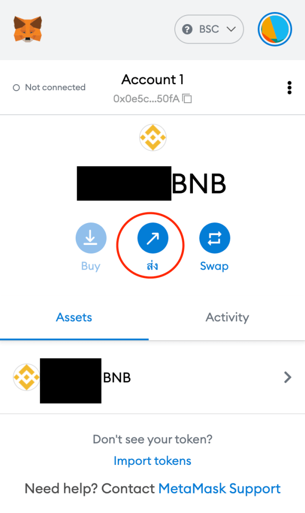 หลังจากได้ BSC address ของปลายทางมาแล้วให้เรามาที่ MetaMask ครับ เชคให้ชัวร์ว่าอยู่ที่ BSC network เสร็จแล้วเลือกเหรียญ BNB -> Send(ส่ง) แล้วเอา BSC address ที่ copy มาวางลงไปเชคให้ดีนะครับว่า address ถูกต้อง