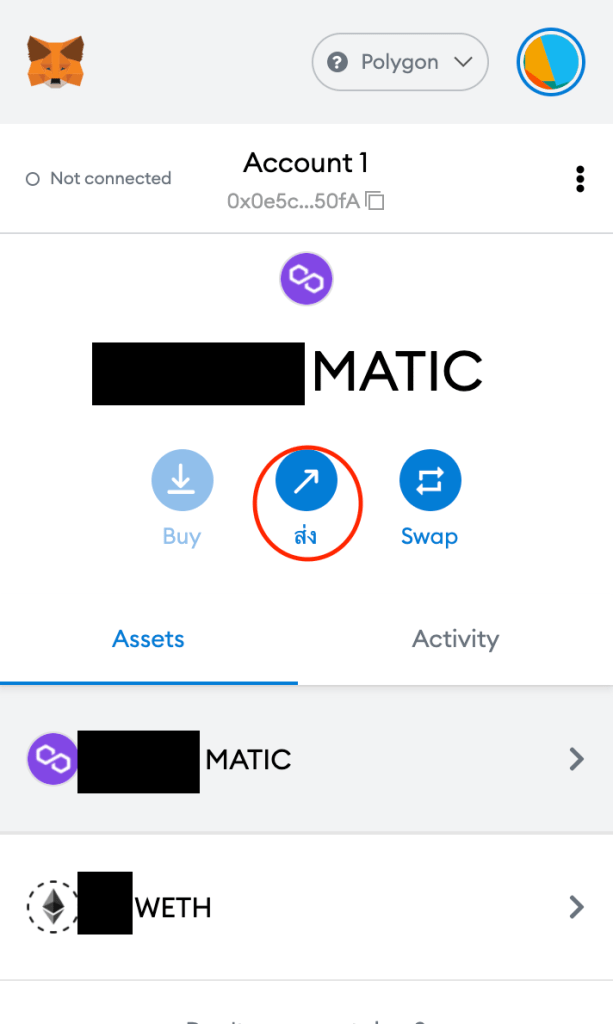 หลังจากได้ Matic address ของปลายทางมาแล้วให้เรามาที่ MetaMask ครับ เชคให้ชัวร์ว่าอยู่ที่ Matic(polygon) network เสร็จแล้วเลือกเหรียญ MATIC -> Send(ส่ง) แล้วเอา Matic address ที่ copy มาวางลงไป เชคให้ดีนะครับว่า address ถูกต้อง